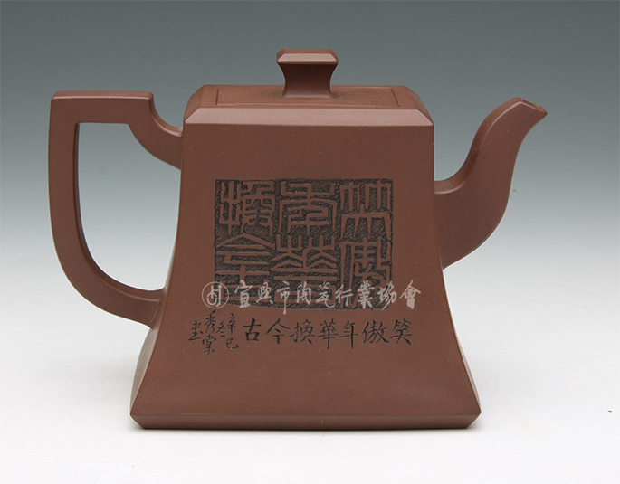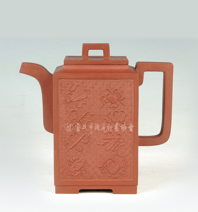 作品造型设计以方为主,呈高扁方型,在传统方器作品上,加以修改提炼。以传统紫砂“打片镶接法”成型制作,再以传统手工工艺装饰,造型端庄,工艺精湛。
