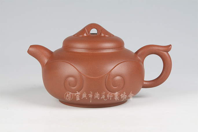 壶身上下层次分明,并分饰四枚如意卷曲纹。圈足使壶身增加端庄之雅味,弯流,环把上端设飞耳,克盖上设如意桥梁钮。传统文化气息浓厚,创新设计构思新颖,气韵生动,实用与艺术欣赏功能俱佳。