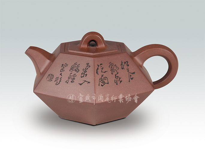 作品造型端庄平和,上下各六个块面均衡规整,壶盖为六方嵌盖,壶身块面滋润、浑厚,见功见力。把中国古代最常见的量具“斗”的文化内涵——“公平、公正”体现在紫砂壶艺之中。