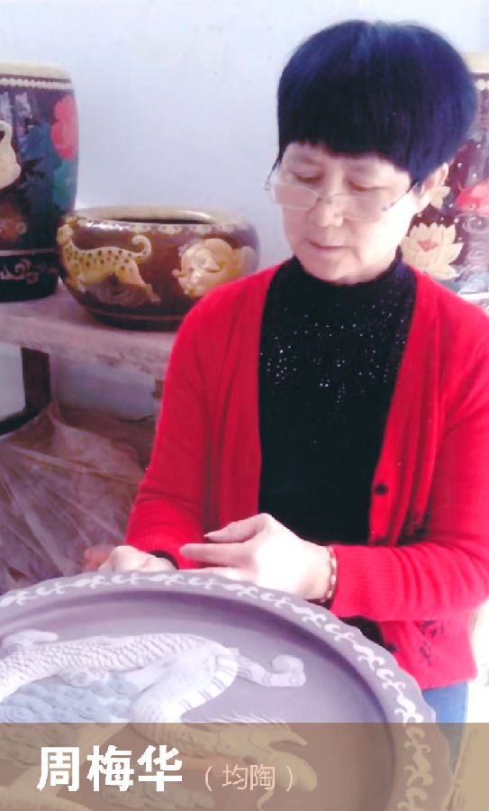 几十年堆花艺术生涯中与师兄一起研讨堆花艺术创新设计的开发工作。她所创作的堆花作品“蟠龙陶台”、“凤飞盘’’、“獬豸”瓶、“散花金鱼缸”等一大批堆花艺术品,在中国工艺美术百花奖、中国陶瓷艺术博览会、中国质量万里行陶瓷精品博览会等重大展评中屡屡获奖,为企业赢得荣誉作出了重大贡献,并荣获国家级非物质文化遗产传承人之一。