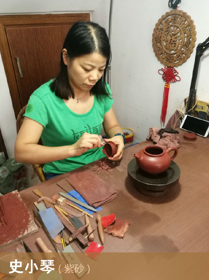 史小琴(晓勤),1970年生于风景秀丽的太湖之滨——双桥。1986年进紫砂工艺二厂学艺,精心学习紫砂陶艺的制作与创研,经过不懈的努力和专心的揣摩,打下了扎实的专业功底,领悟了紫砂艺术的精髓,逐渐形成了具有自己独特的艺术风格。一九九零年进入南京艺术学院进修造型设计专业,在创作道路上又有幸得到了蒋蓉大师的细心指导,使得创作思路和创新能力有了更大的提升。每件作品都力求精益求精,所制作品讲究线条的流畅与和谐,形态比例的协调与恰当,深受光大壶友及收藏家的亲睐,作品屡次参加国内外大型陶瓷展览并获奖,代表作入选大型专业书籍《陶魂》《宜陶人》及《壶论》等。