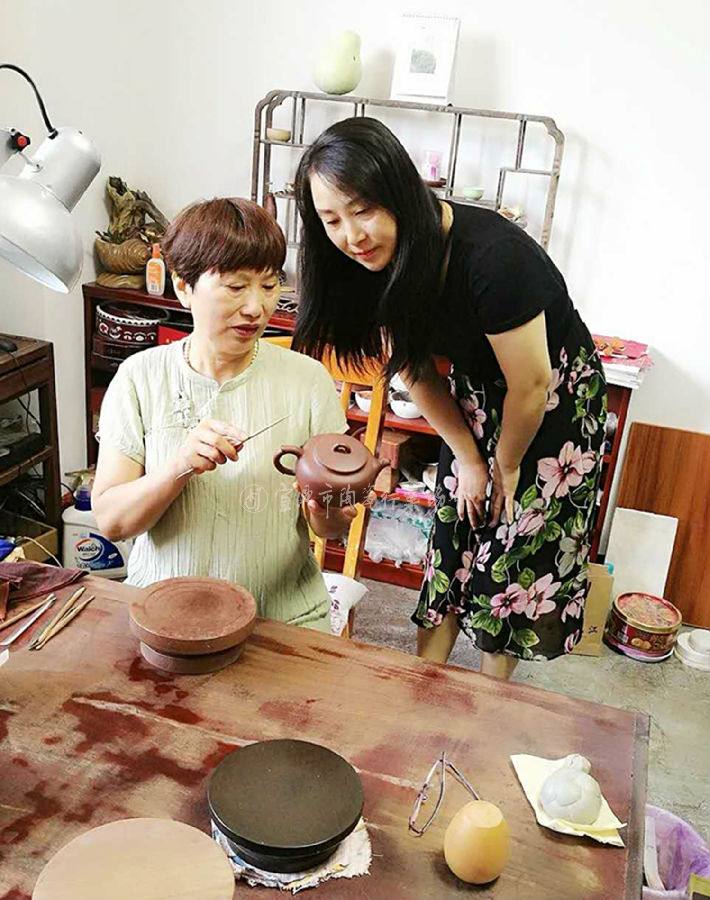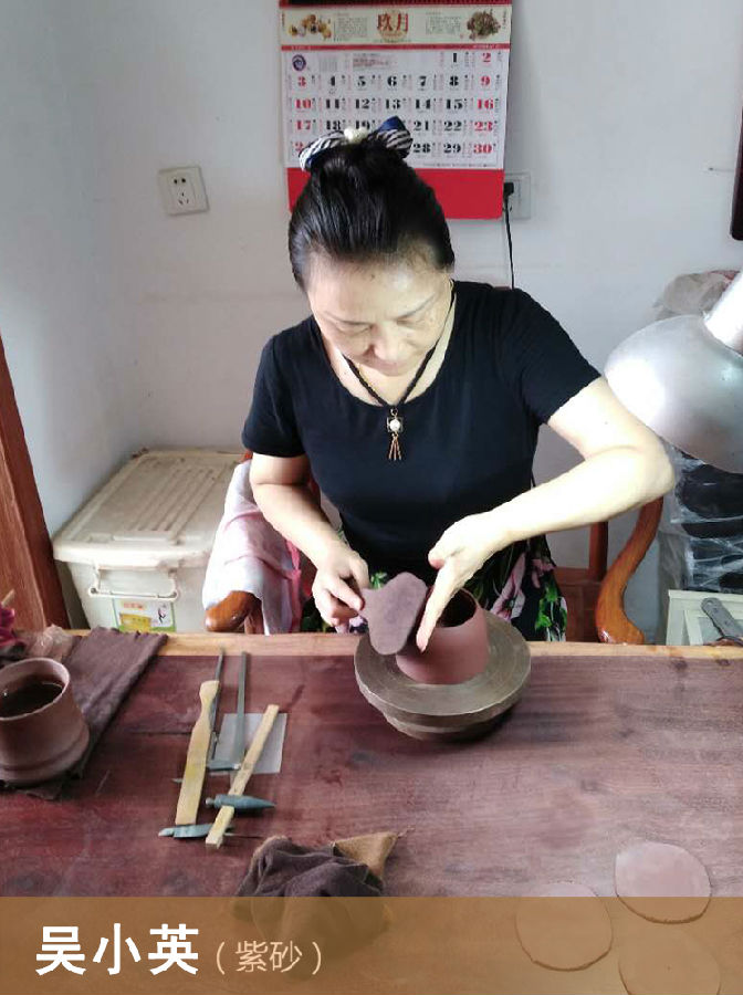吴小英(晓英),1970年出生于宜兴丁山潜洛村,由于从小对紫砂壶技艺的耳濡目染,对此产生很大兴趣,于是在1988年高中毕业后回乡从事紫砂壶制作,先后临摹了许多名师作品,师古于泥不拘,好学多问,勤耕苦练,夯实了扎实基础。200O年初又拜花器巨匠,中国工艺美术大师蒋蓉传人蒋艺华为师,在名师的指点下,思路更宽,技法更硬,不论光塑器,还是方器,筋纹器及花器,样样精通,目前技法和艺道非常全面。现毕业于江苏经贸学院大专,2OO9年自主创新《心缘提梁壶》获手工制陶大赛三等奖,2010年创办“吴氏紫砂”工作室。