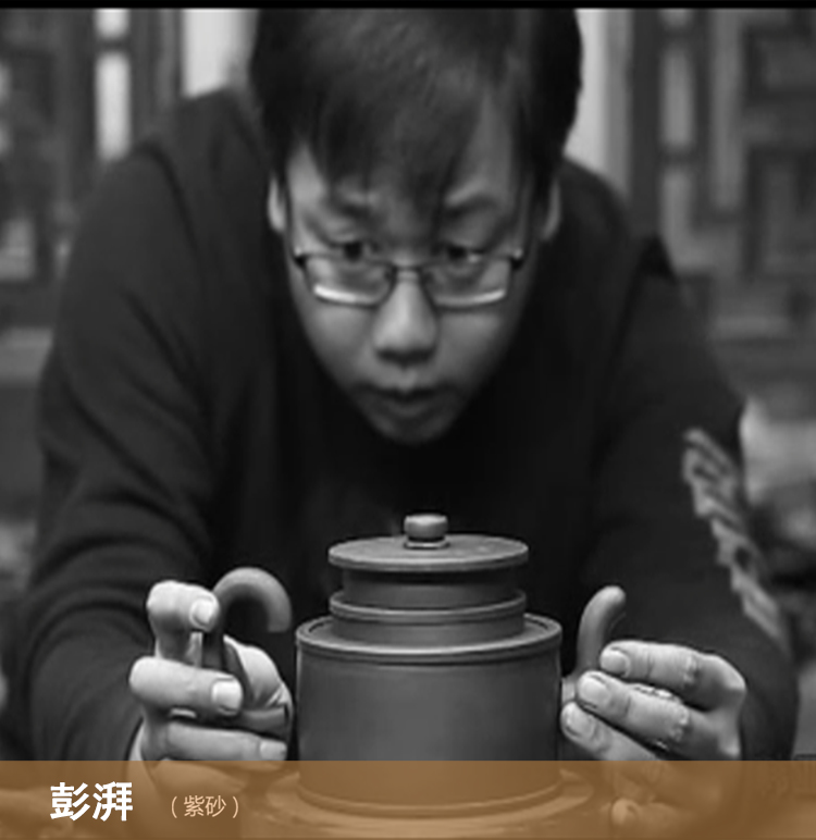 1986年出生于江苏宜兴,祖父彭淦生50年代初首批与任淦庭、斐石民、吴云根、王寅春、朱可心、顾景舟、蒋蓉等七大老艺人一起创建蜀山陶业合作社。父亲彭耀年先生为紫砂界原创型资深艺术家,从小耳濡目染,使他自幼便对紫砂怀有一份挚爱的心,大学毕业后,他便开始了对紫砂艺术的漫漫追求之路,师从高级工艺美术师鲁文琴与江苏省陶瓷艺术名人陈国宏学习全手工制壶技艺,刻苦踏实,勤奋好学。为了进一步提升自己的理论知识和专业素养,2012年进入南京师范大学工艺美术学院进修,俨然是新一代学院派和实力派紧密结合的新生代陶艺家代表,作为紫砂文化传承的年轻一代的代表,彭湃始终坚持踏实二字,从做人做事到做壶都拒绝浮夸之分。在他的生活中,泥料选矿、手工炼泥、全手工成型、壶体的造型设计、工艺装饰,到作品烧成及火候温度的掌握等必须亲力亲为。做好每一步,才能做好壶。他脚踏实地的践行着传承传统紫砂艺术创作工艺、创新现当代时尚文化紫砂创作风格、弘扬传统文化艺术精髓。土生万物,境由心造,烹茗问道,抟泥塑壶。他总是安安静静的徜徉在五色土的世界中,用那一把泥演绎着一部部传奇故事。也将自己最深沉的情感蕴含于作品中。而今的他年轻而富有朝气,饱含着龙窑火一样的热情,沉浸在紫砂艺术创作的海洋里,持之以恒,锲而不舍。