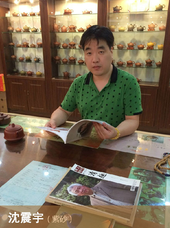 沈震宇(字雨轩),1975年4月生于宜兴,自幼得到紫砂壶艺的熏陶。1992年进入紫砂工艺厂锦达陶艺有限公司,进厂之后得到中国工艺美术大师顾绍培师傅的悉心指导,经过自身的勤奋学习,掌握了紫砂全手工制作的要领和技法,陶艺创作能力大为提高,后又经过工艺美术大师范洪泉的教导,技法更为全面精进。作品主要以传统的圆器为主,主要风格为线条流畅,点线面挺刮,造型纯朴,端正大方,制作精细,力求完美。作品深受好评,并刊登进《盛世茶缘》,《壶论》等专业书籍。并在2011年第四届中国国家级工艺美术精品博览会中获得金奖,2004年全国礼品艺术品博览会中获得金奖,2009年河南首届紫砂艺术节获得银奖等奖项和多家博物馆的收藏。