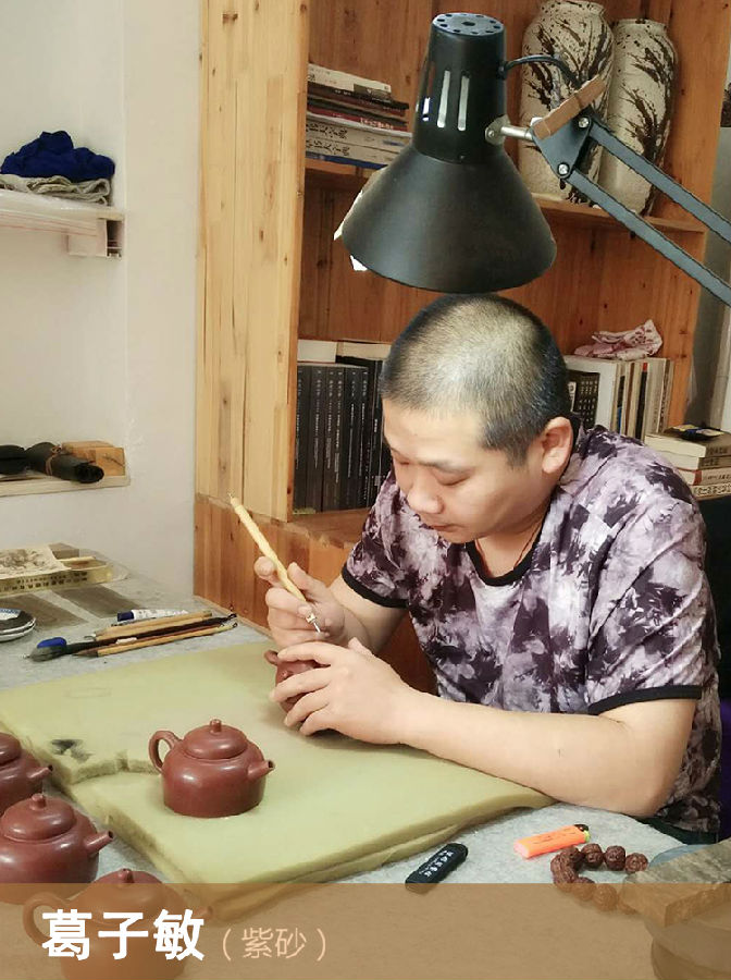 工艺美术师1982年出生于宜兴丁蜀镇陶瓷世家“白宕葛家”。从小受家庭影响,耳濡目染,对紫砂情有独钟。2000年毕业于工艺美术专业,后又于江苏大学产品设计专业继续深造。更好的将理论与实践融入一体,更具备了传统创作的设计能力。作品书画结合,围绕人物,山水,花鸟等创作素材,依托传统刀法,更好的加以表现;并多次在展评中获奖,深受紫砂爱好者的喜爱。《福禄茶仓》《阔渚晴峰对瓶》清供水仙盆硕果《松鹤延年》《一念之间》 (以上图片资料均由作者本人提供)